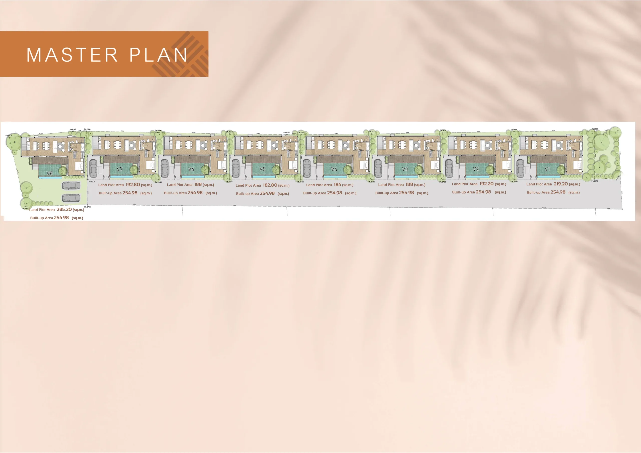 Master plan view of row of villas with individual pools