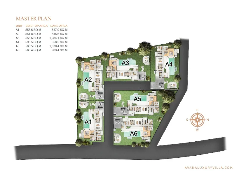 Aerial site plan of villa complex with blocks A1-A6 and roads