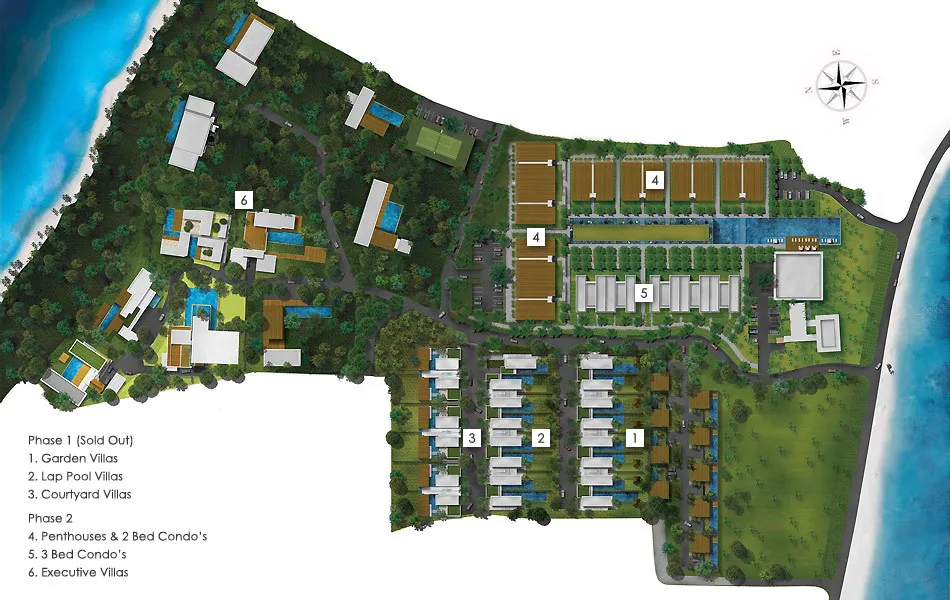 Coastal resort site plan with villas and pools