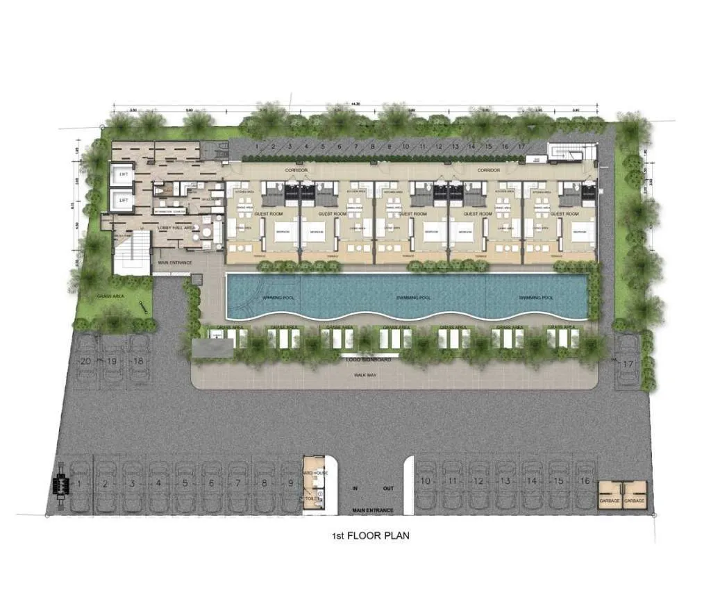 Practical layouts emphasize privacy and easy living. A 34 m lap pool is set among palms at the entrance, while the eighth-floor Sky Garden offers a 5 x 13.6 m infinity pool. Parking and CCTV add everyday convenience.
