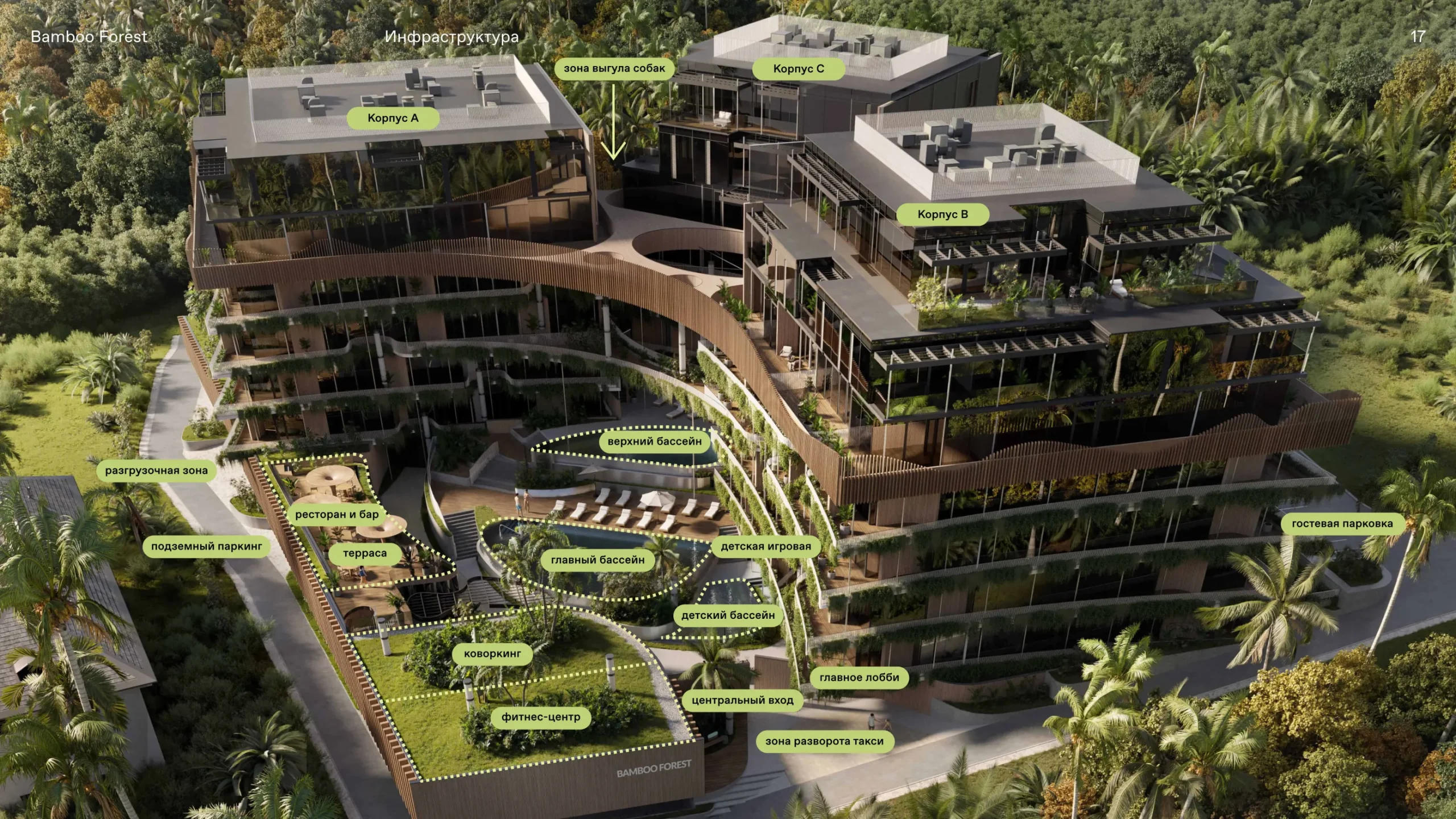 Design-led apartments in three buildings: Wave (A), Rhythm (B), and Ethnic (C). Spacious layouts open to terraces with city and mountain views. Natural materials—wood, stone, polished concrete, graphite glass—pair with curved facades and greenery-wrapped balconies. Smart home functions manage climate, lighting, and security, while dedicated storage rooms add practicality.