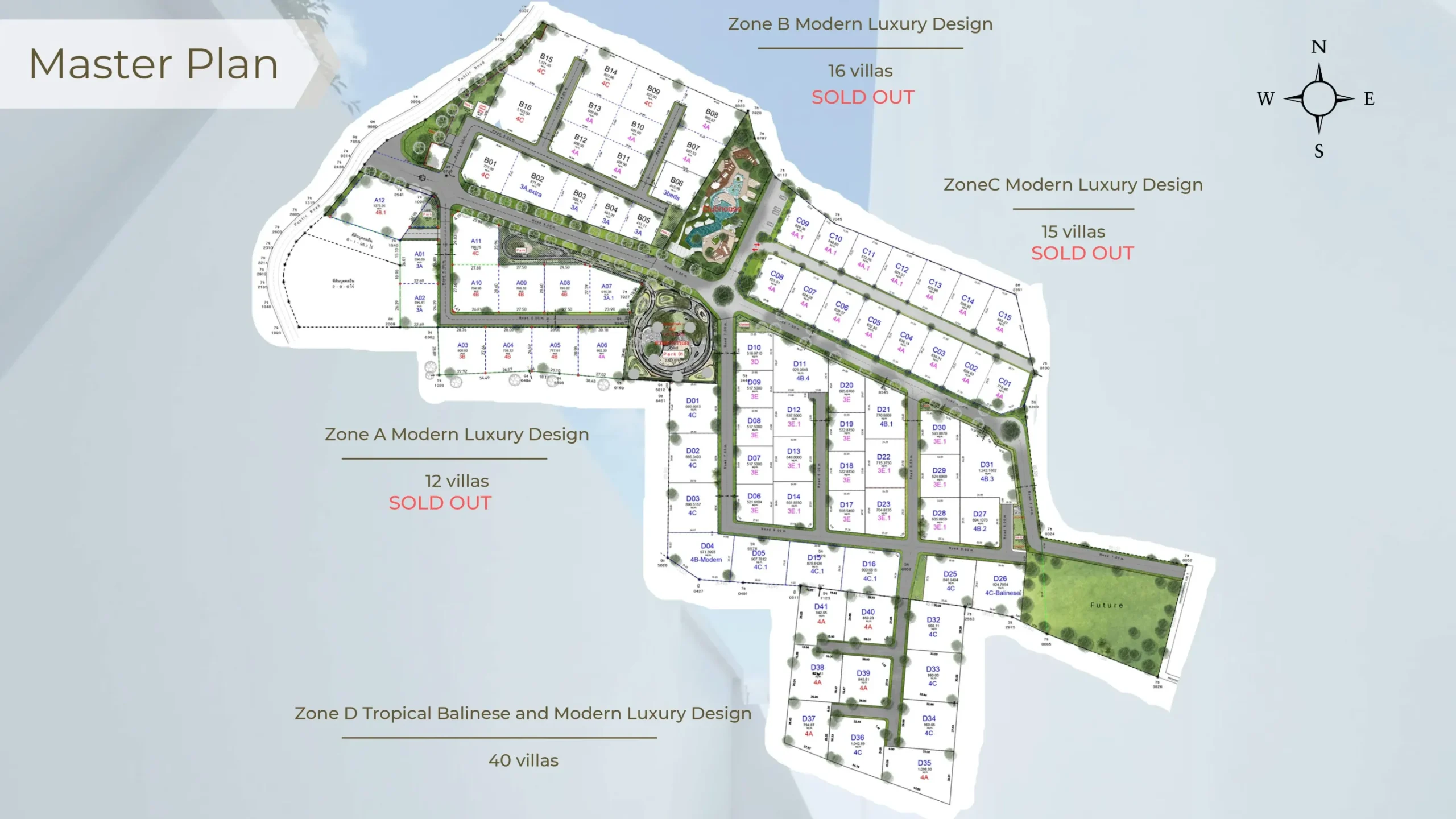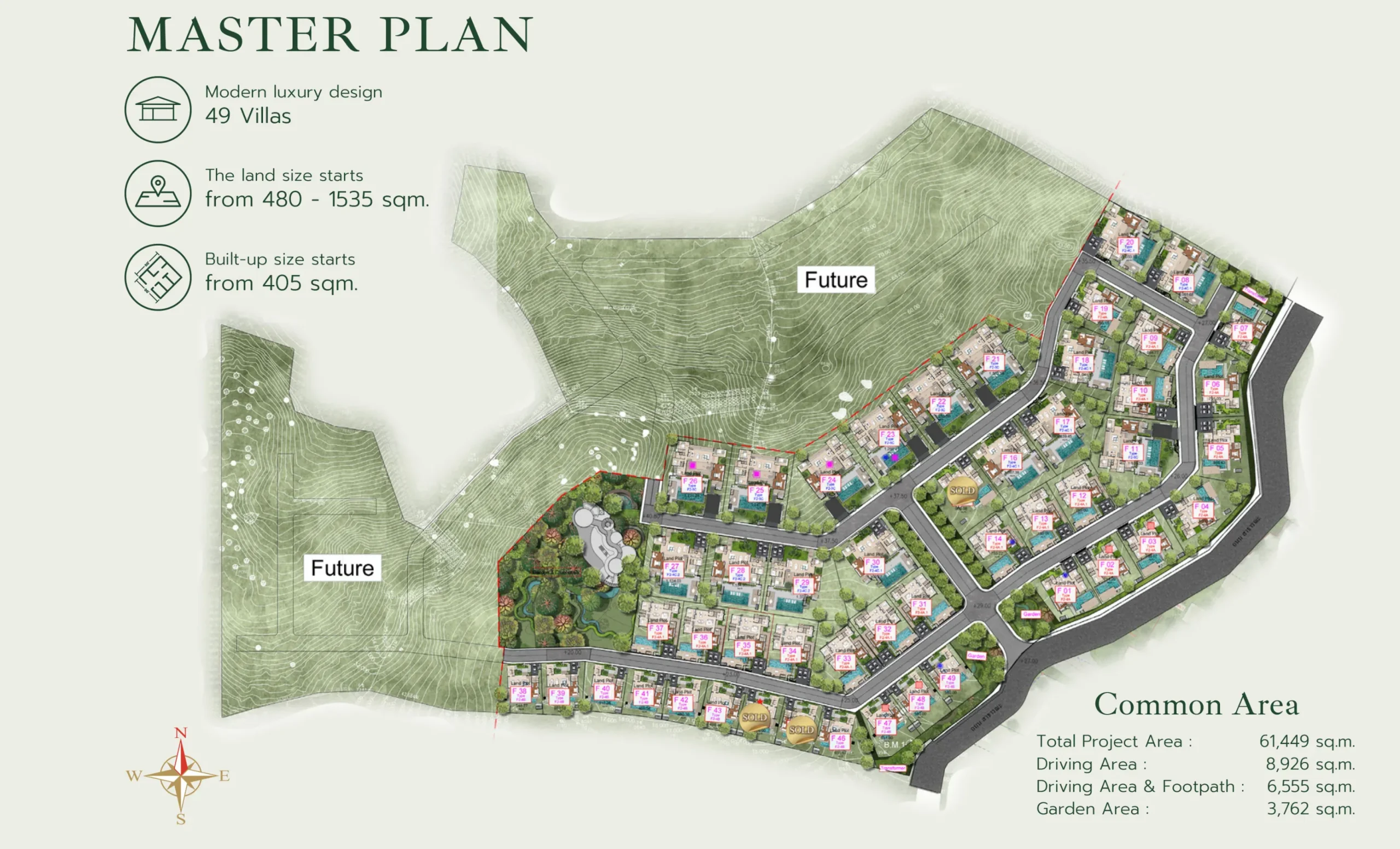 Single-storey villas designed for easy, step-free living with indoor–outdoor flow. Spaces open toward landscaped gardens and pool outlooks. Tenure options include Freehold/Leasehold. Security and CCTV are part of the concept, with off-plan construction and completion set for 01.2024.