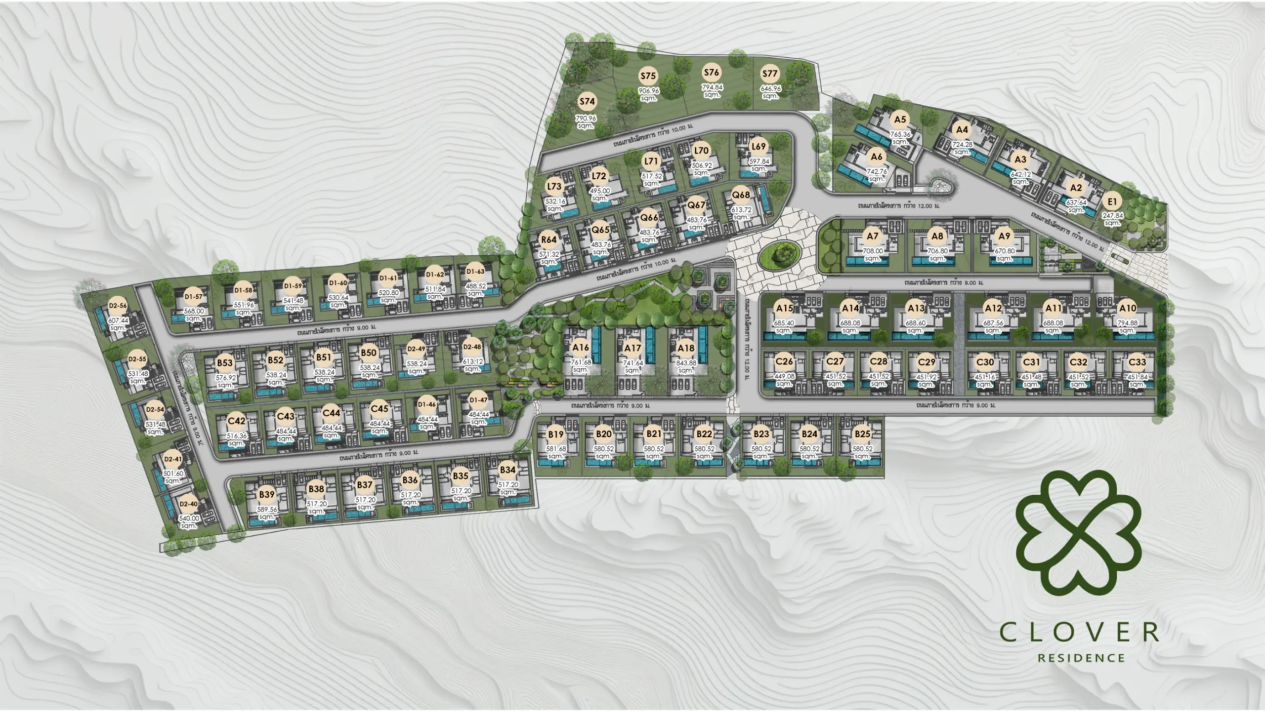 Clover Residence is a low-rise project on flat terrain in Bang Tao, Phuket, with 1–2 storey configurations, communal landscaping, and 24/7 CCTV. Freehold/Leasehold ownership is available.