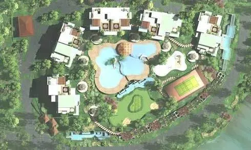 Aerial view of tropical resort with central irregular pool and surrounding villas