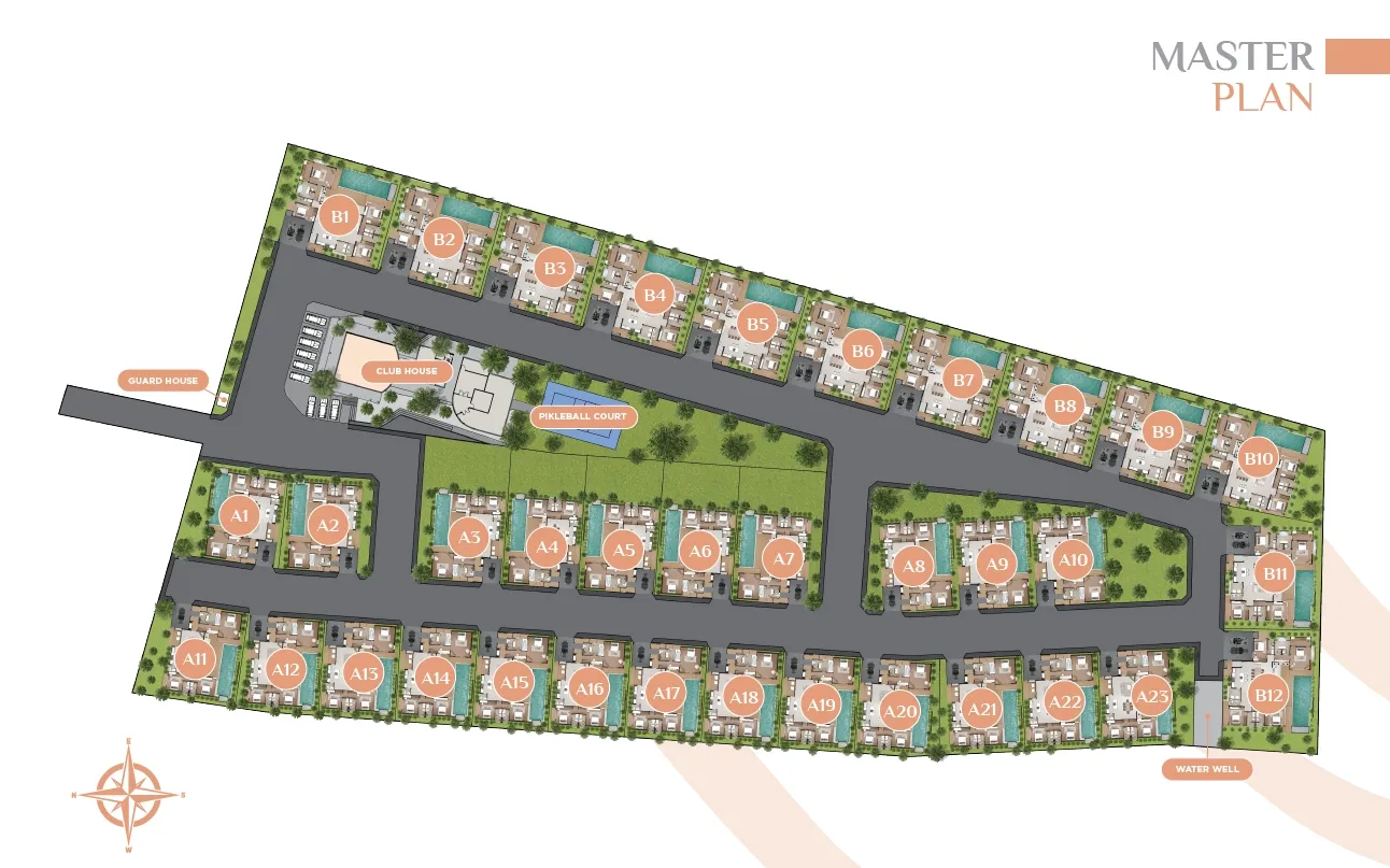 Aerial masterplan showing A1–A23 and B1–B12 blocks, clubhouse, and pool