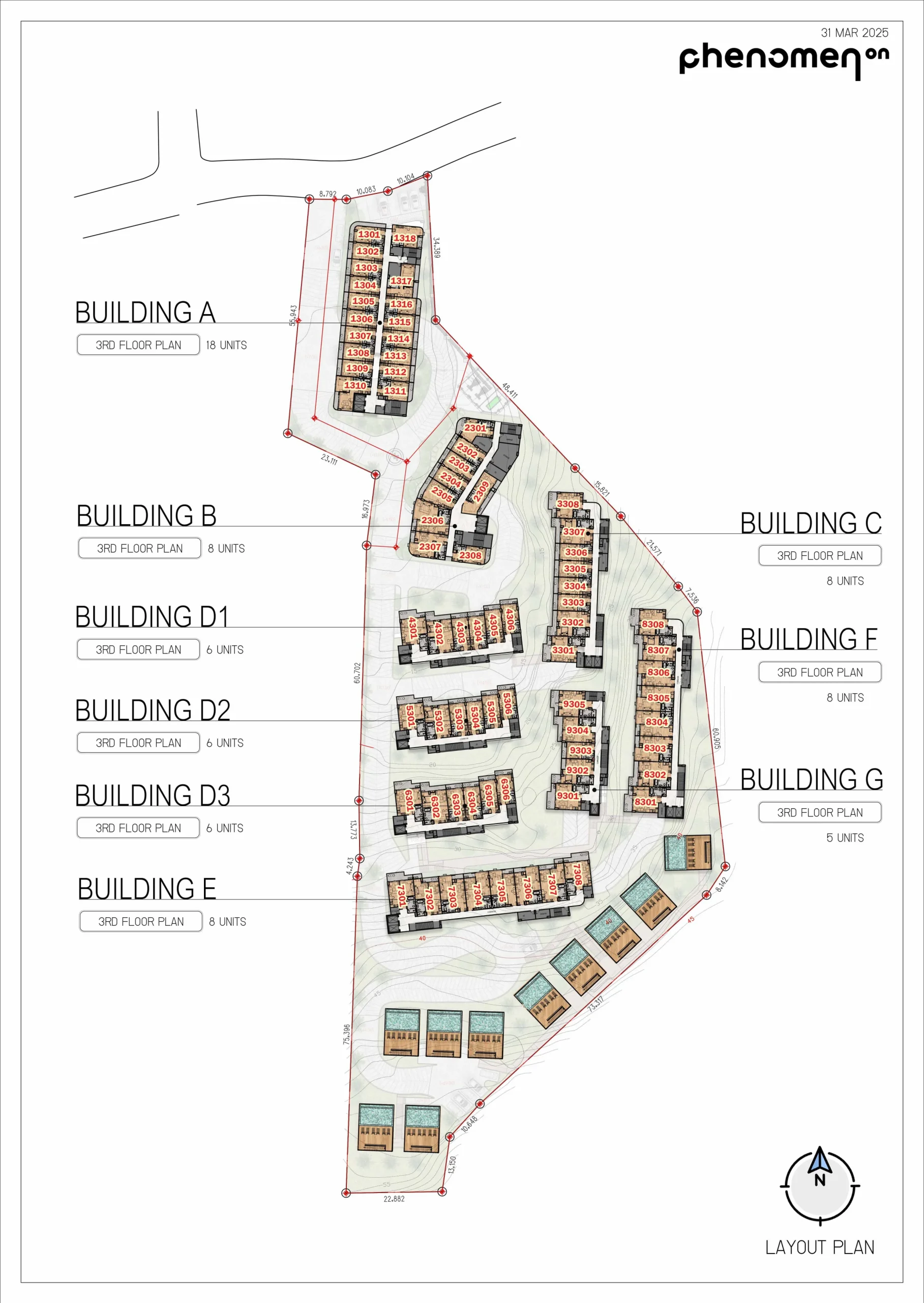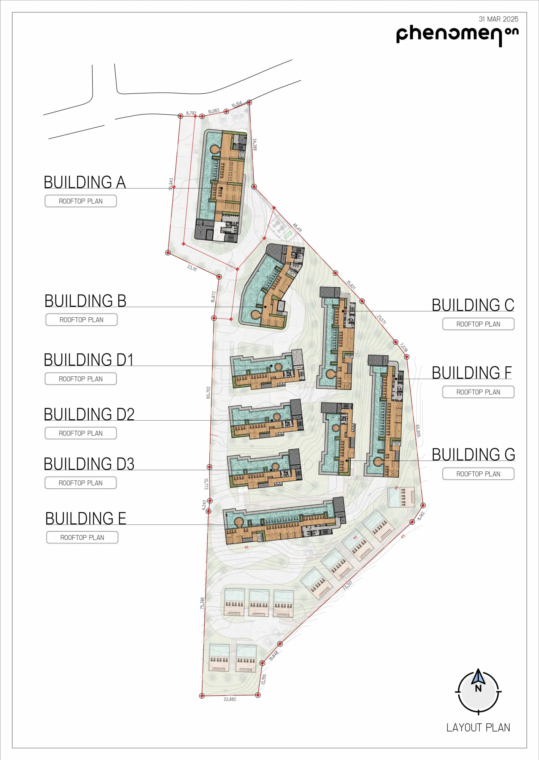 Phenomenon is a contemporary hillside condominium 400 m from Kata Beach, master‑planned over 13 800 m² with sea‑oriented architecture and calm pedestrian streets served by golf carts.