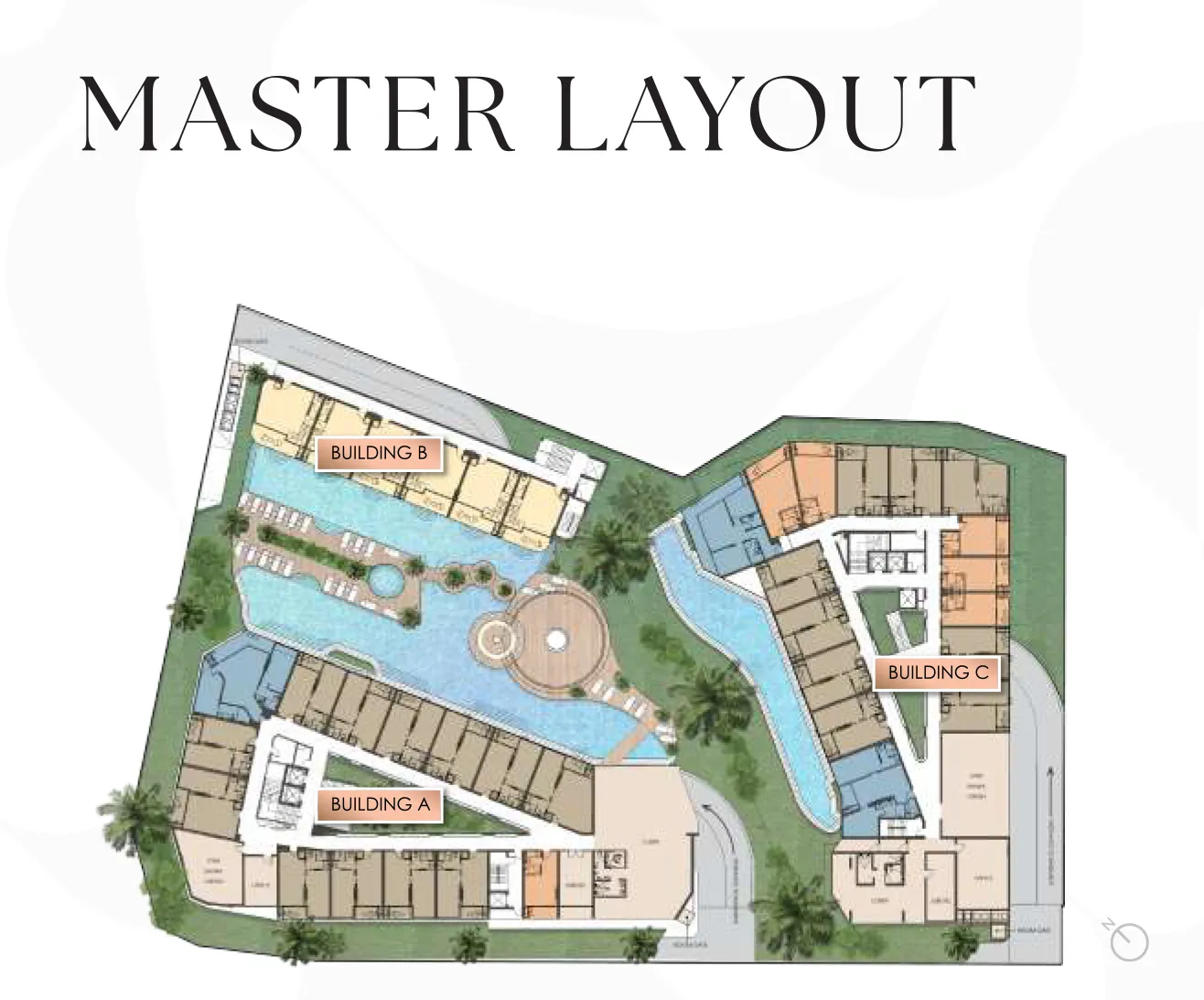 Aerial site plan showing three labeled buildings around a central blue pool