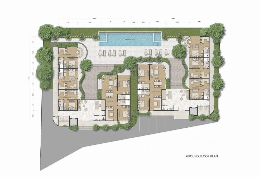 Ground floor plan with central garden and pool
