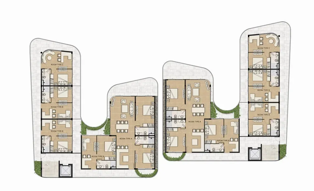 Curved multi-unit floor plan with living areas and bedrooms