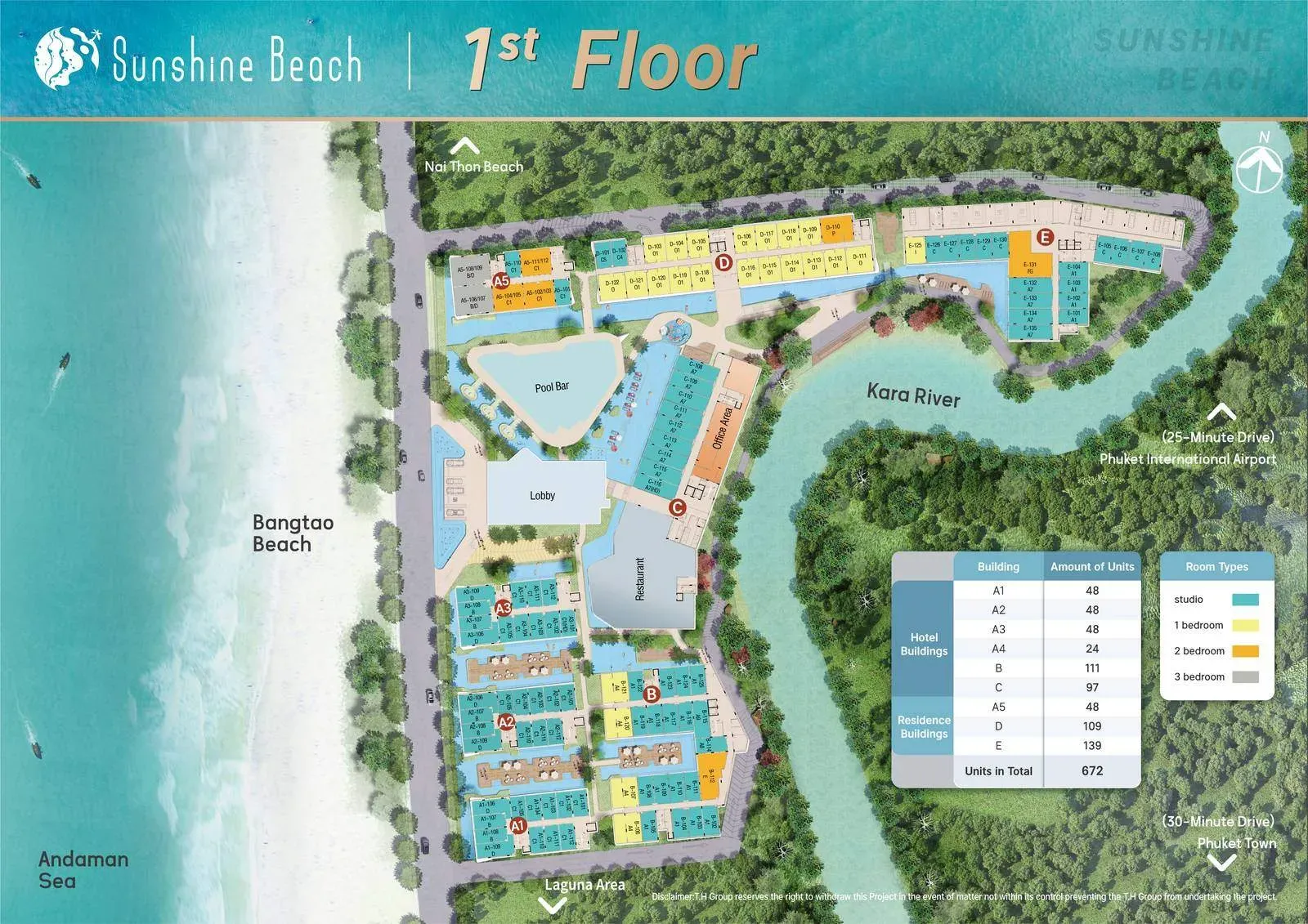 Set on Phuket’s west coast at Layan, the project sits near Bang Tao (about 5 minutes by car) and lifestyle spots including Boat Avenue, Porto de Phuket (5–10 minutes), Catch Beach Club, and Laguna’s golf. Phuket International Airport is roughly 20 minutes away. Explore more: Villas for sale in Layan and Phuket area guide: Layan.