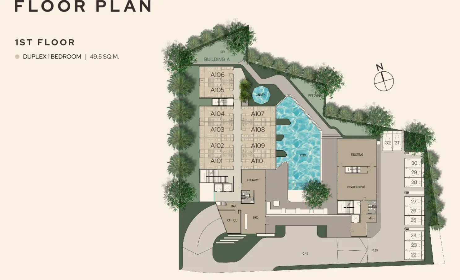 The project rises 7 storeys and is organized around practical shared facilities: a family-friendly pool, onsen hot bath, coworking and meeting spaces, and wellness areas for fitness and yoga. The guarded grounds include 39 parking spaces and security with CCTV.