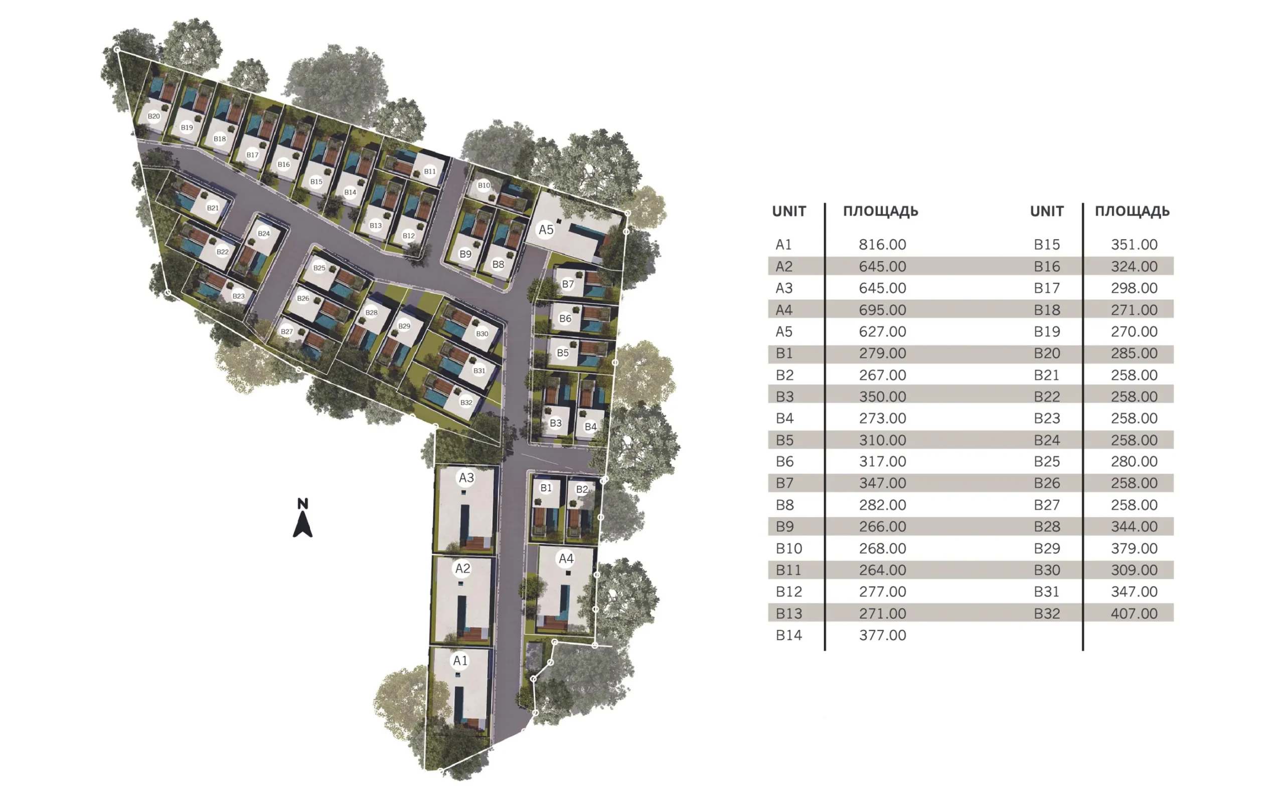- 31 villas; 271–897 m² build-up