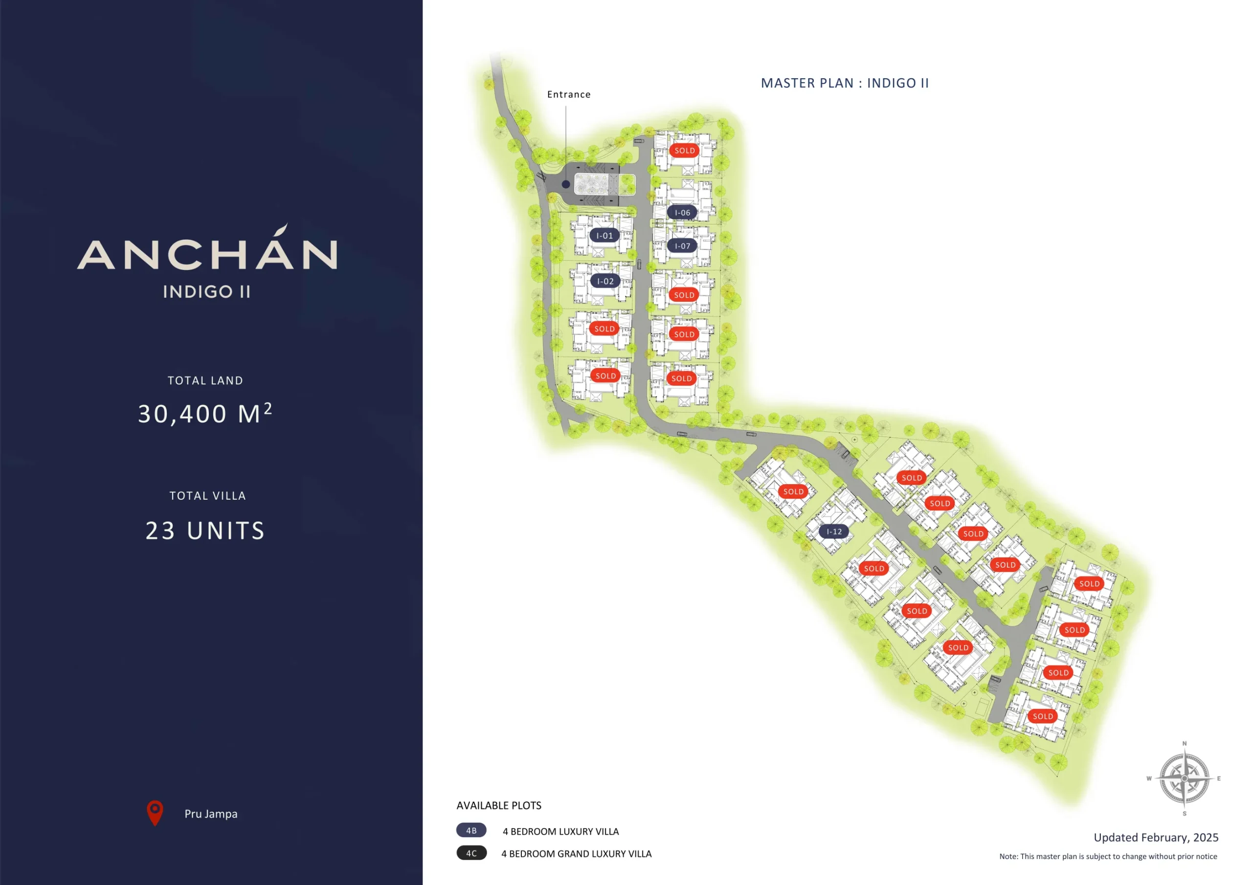 Anchan Indigo — одноэтажная концепция на равнинном рельефе с ориентацией на виды бассейна и сада. Форматы владения: Фрихолд/Лизхолд. Проект вне плана, срок завершения пока неизвестен. На территории — офис управления, гостевой паркинг и кафе, работает видеонаблюдение.