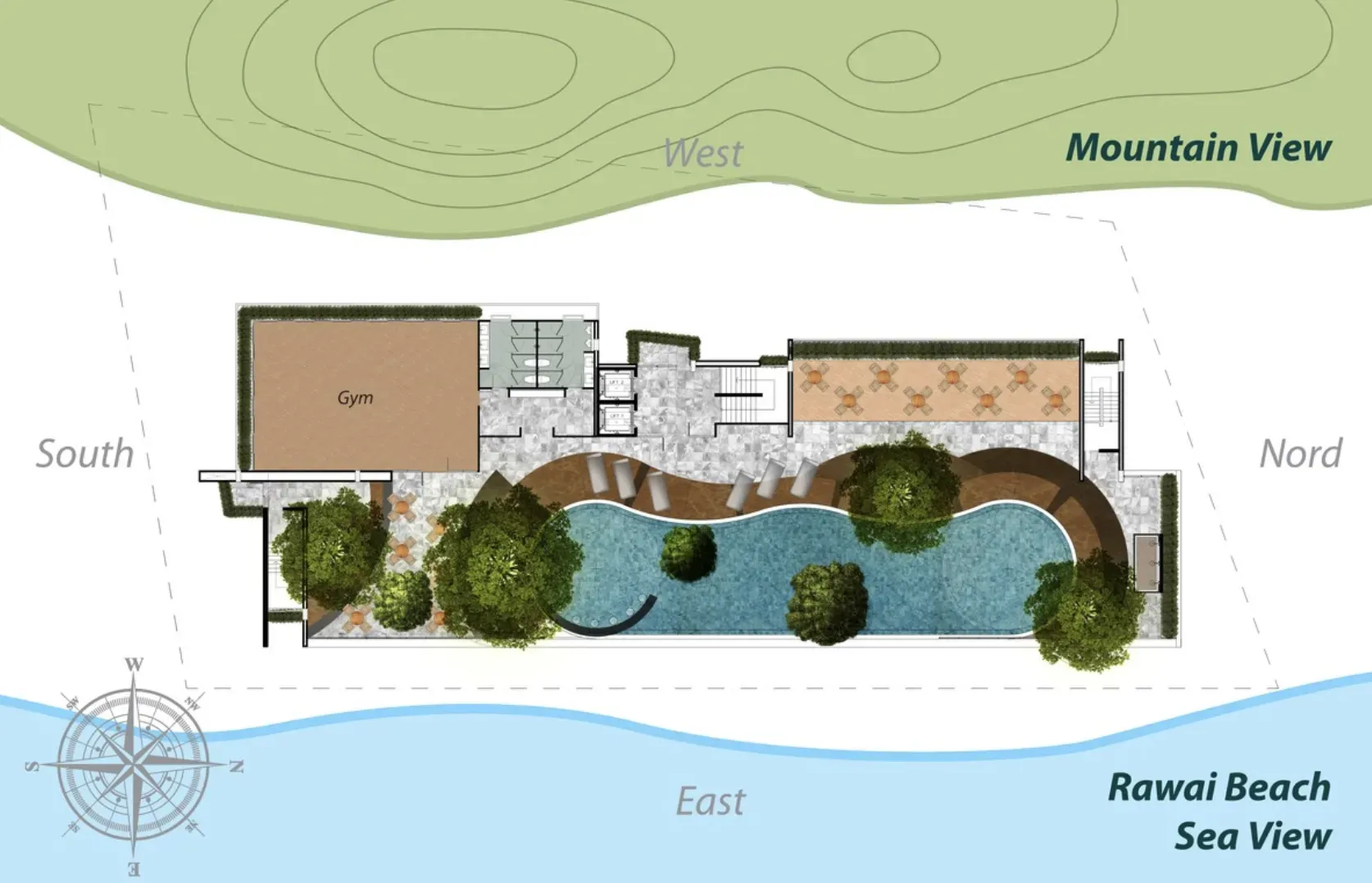 Calypso Garden — готовый бутик-комплекс апартаментов в Раваи на юге Пхукета. 550 м до пляжа Раваи и 2,8 км до Най Харн. Апартаменты от 45 м² с балконами, крупными окнами и качественной отделкой; виды на море, горы, сад или бассейн. В комплексе: бассейн с террасой, кафе-бар на крыше, спа-зона, спортзал, подземная парковка и охрана 24/7 с CCTV.