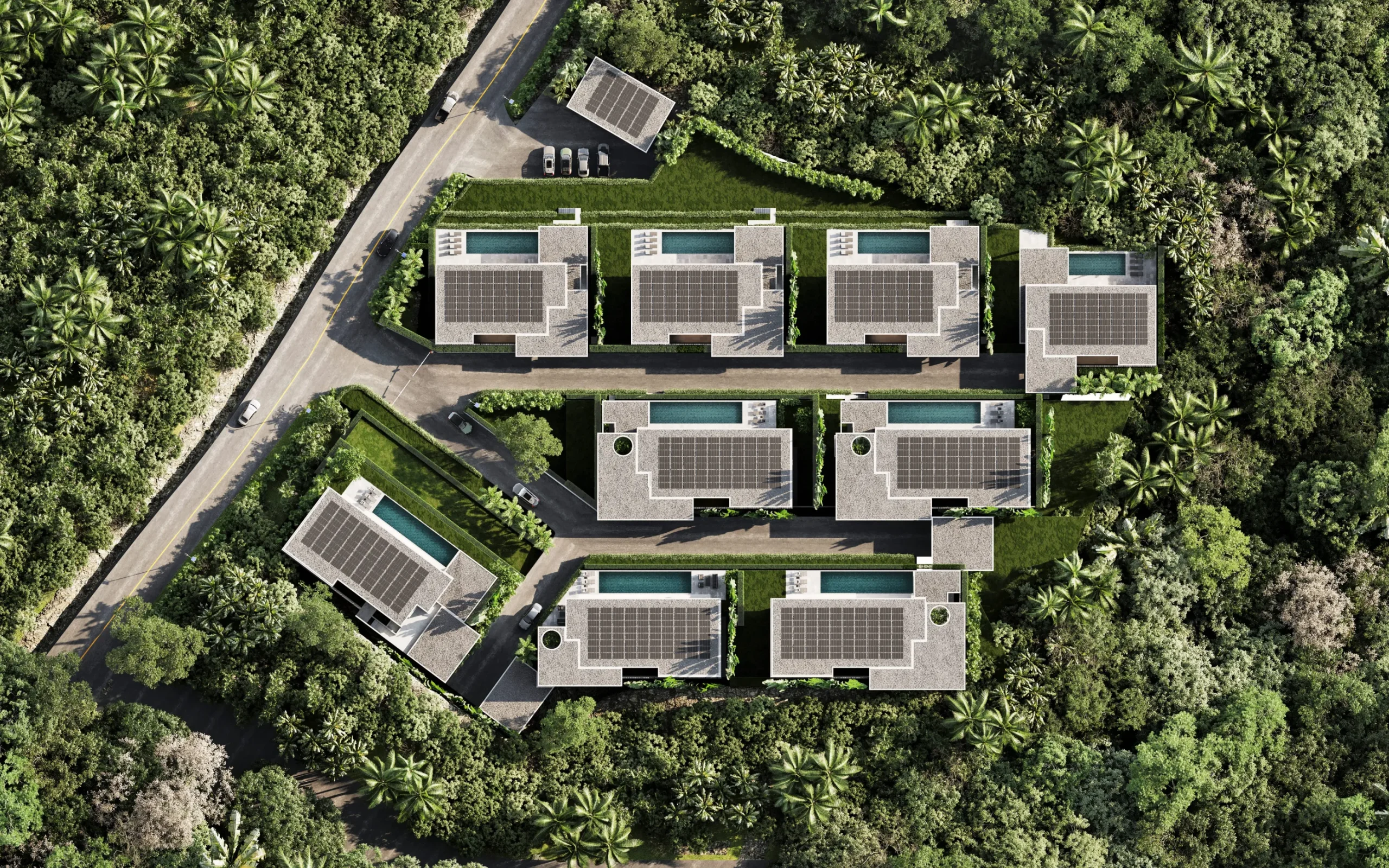Аэросъемка сверху современного комплекса вилл с солнечными крышами и бассейнами