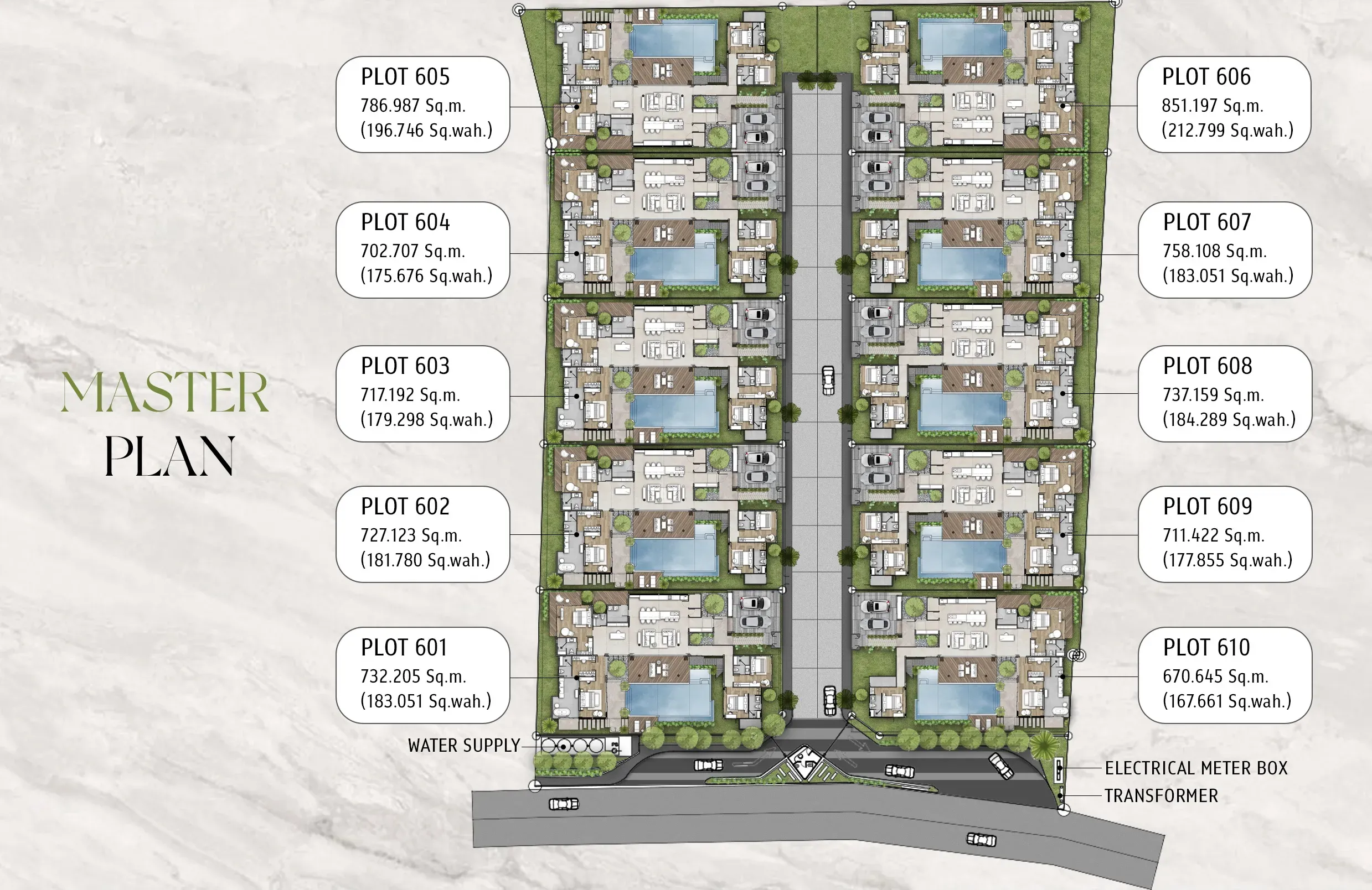 Одноэтажные решения для удобства повседневной жизни. Предусмотрены индивидуальные водомеры и электросчётчики; из резиденций вид на бассейн и зелёные зоны.