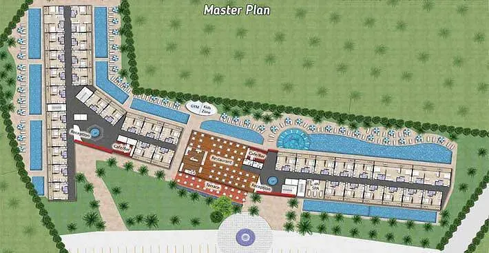 Аэрофотоплан курортного генерального плана с голубыми бассейнами и зеленью
