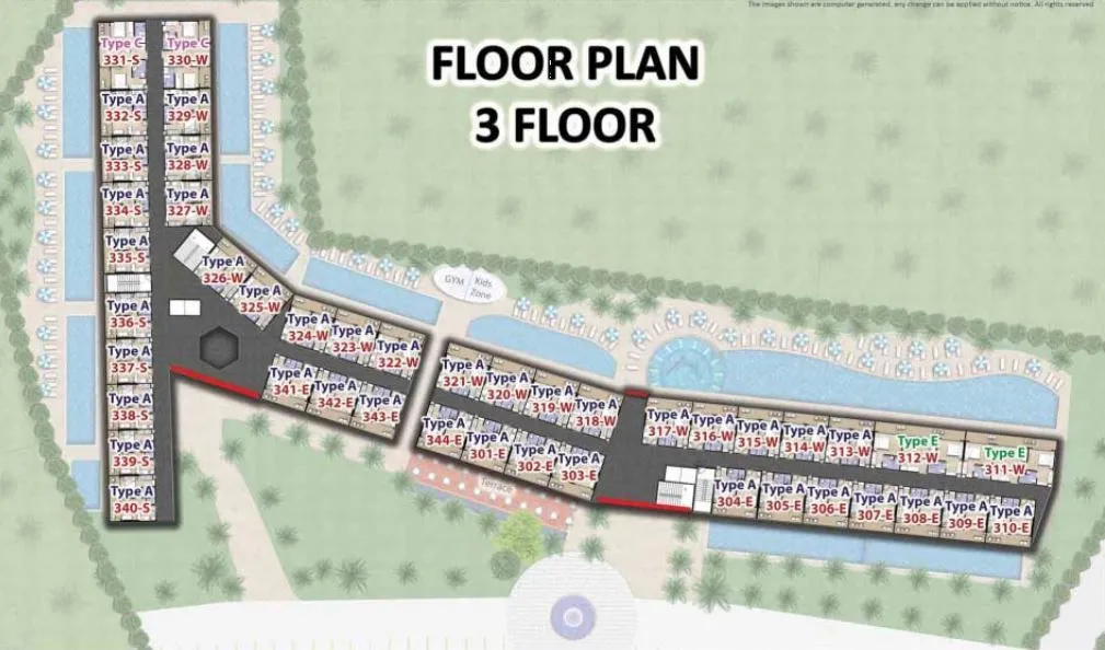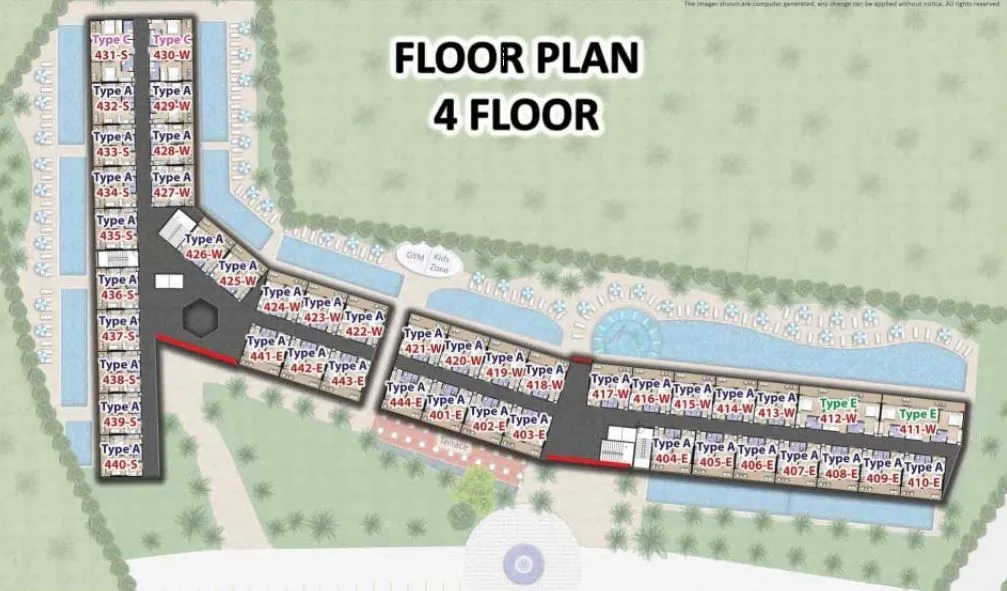 Пятиэтажный план этажа с блоками квартир и бассейном