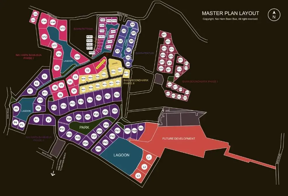 Nai Harn Baan Bua Pattama — охраняемый комплекс из 15 одноэтажных вилл в Най Харн, Пхукет. Участки 195–520 м², застройка 120–305 м². В каждой вилле частный бассейн, терраса и тропический сад, приватность обеспечивают зелёные изгороди; виды на горы и сады.