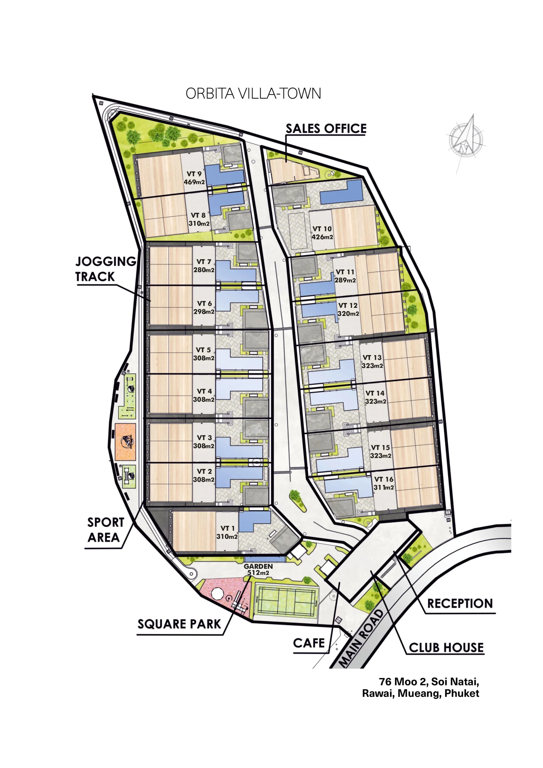 Orbita Villa Town в Раваи, Пхукет: двухэтажные виллы на равнинном рельефе с видами на бассейн и сад, террасами и парковкой на два авто.