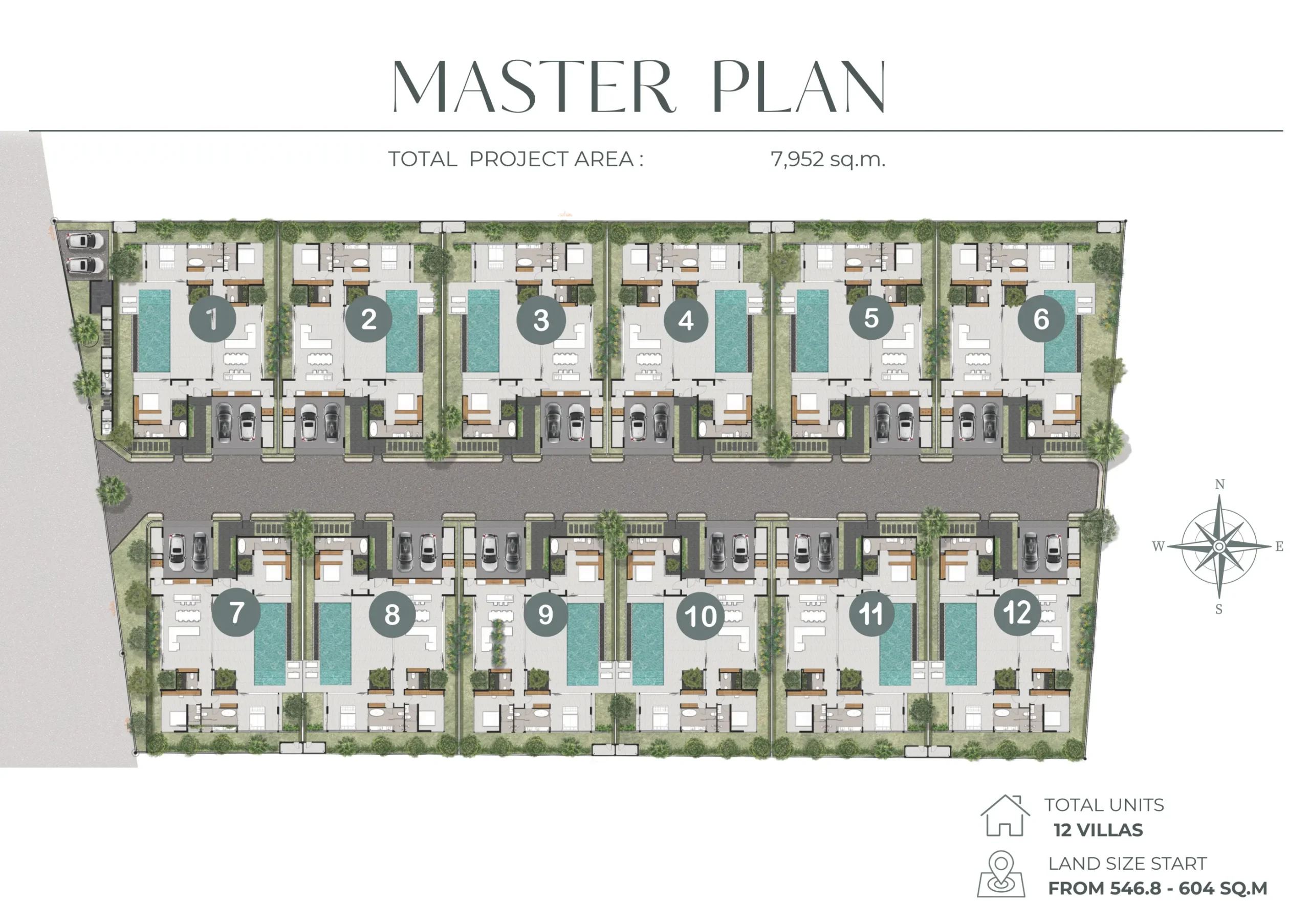 Внешний план участка двенадцать вилл с бассейнами