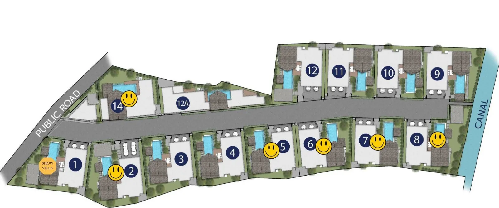 Проект — строительство вне плана; срок завершения неизвестен. Дома на двух этажах, на равнинном рельефе, с ориентацией на бассейн и сад. Доступны Фрихолд/Лизхолд. Безопасность: видеонаблюдение и офис администрации на территории.