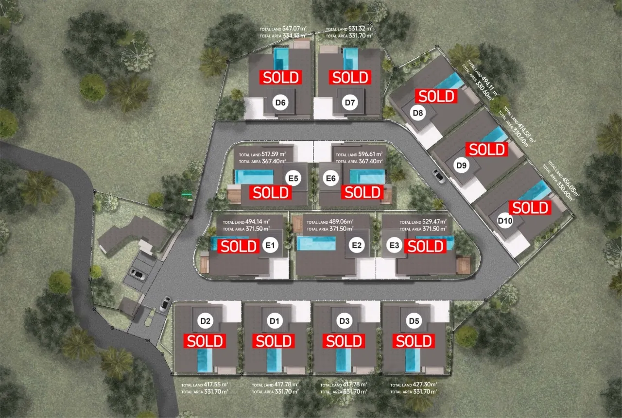 Аэро-схема вилл: план застройки с помеченными SOLD домами