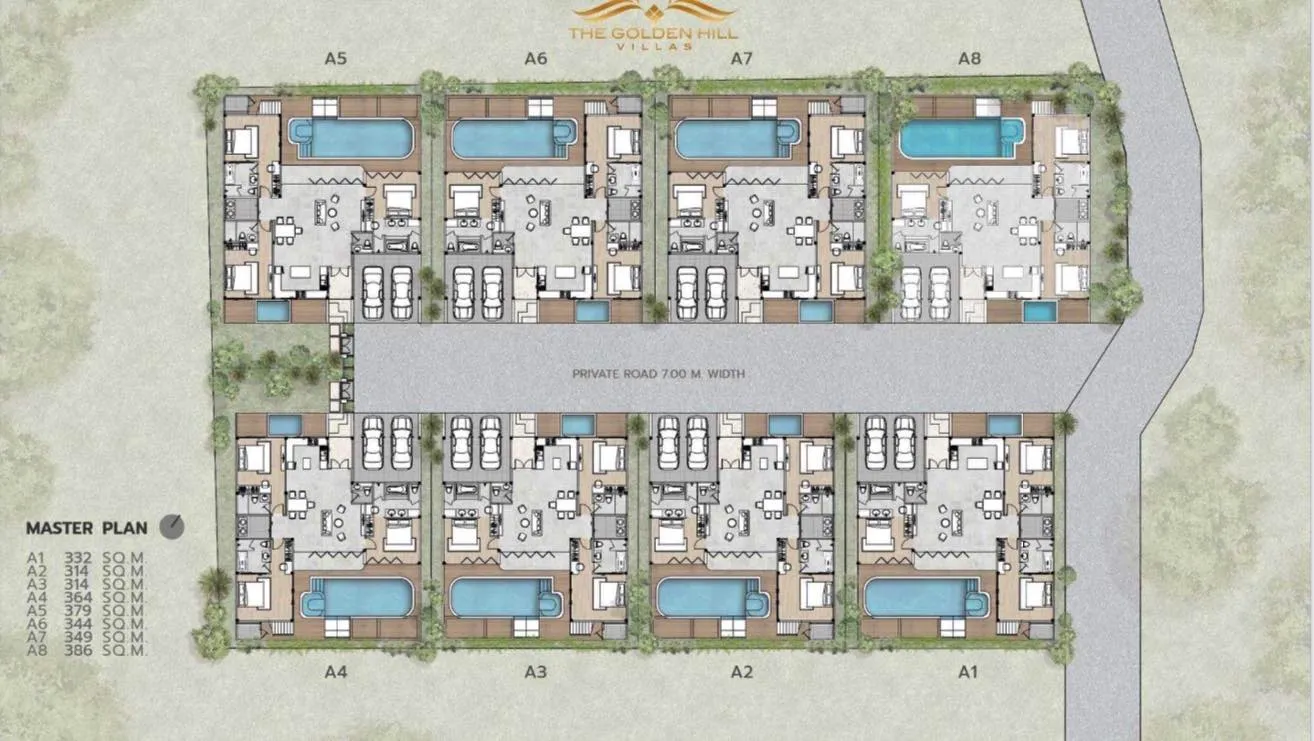 The Golden Hill — проект вне плана с одноэтажной планировкой для комфортного повседневного быта. Окна ориентированы на бассейн и садовые зоны. Доступны варианты владения Фрихолд/Лизхолд. Охрана заявлена на территории. Отделочные материалы и сроки уточняются, дата завершения пока неизвестна.
