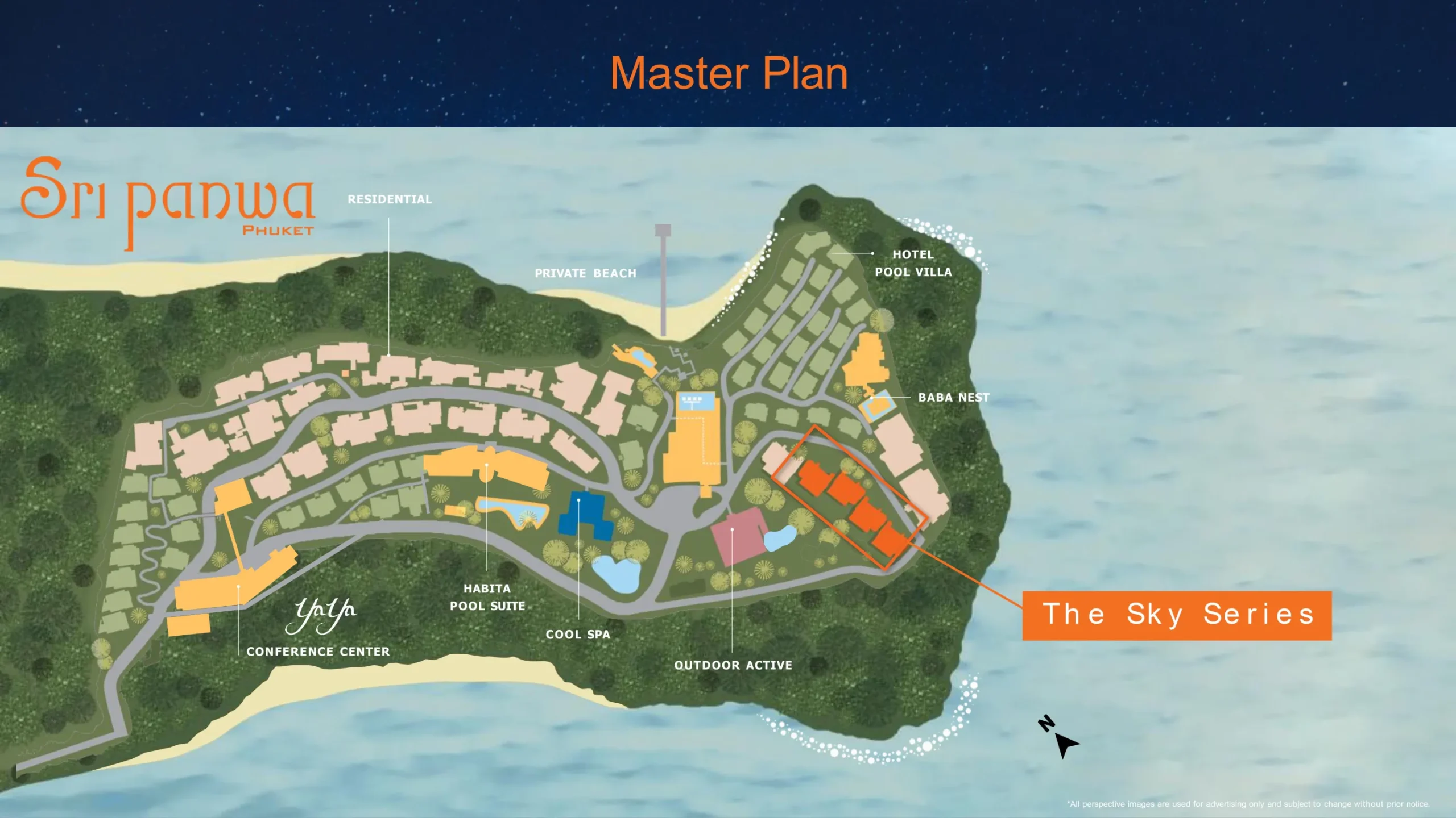 Воздушная карта плана курорта с виллами The Sky Series у побережья